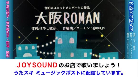 2022年5月14日(土)の 午前10時からキョクナビ(リモコン端末)で歌手名:なつかわあきこあおきみなこわかひとみ、あるいは曲名:おおさかろまん で選曲可能となる予定です。
