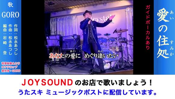 2024年6月8日(土)の 午前10時からキョクナビ(リモコン端末)で歌手名:ごろー、あるいは曲名:あいのすみかほんにんえいぞうがいどぼーかる で選曲可能となる予定です。