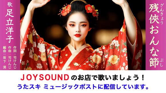 2025年5月23日(金)の 午前10時からキョクナビ(リモコン端末)で歌手名:あだちようこ、あるいは曲名:ざんきょうおんなぶし で選曲可能となる予定です。