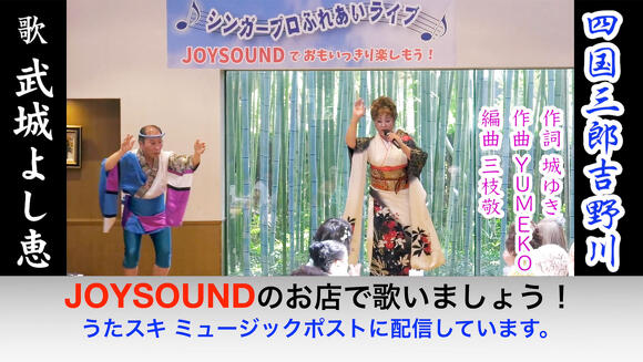 キョクナビ(リモコン端末)で歌手名:たけしろよしえ、あるいは曲名:しこくさぶろうよしのがわ で選曲可能となる予定です。