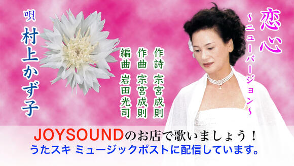2021年5月15日(土)の 午前10時からキョクナビ(リモコン端末)で歌手名:むらかみかずこ、あるいは曲名:こいごころにゅーばーじょん で選曲可能となる予定です。