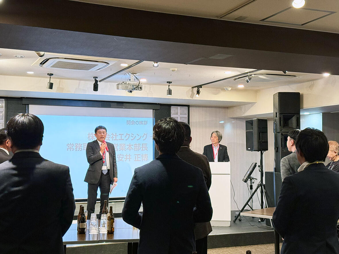 冒頭で、株式会社エクシング常務取締役 安井正博氏が「今日は、同心協力の基本理念のもと、同じ目標に向かって世界を広げていこうと思っている皆さんにお集まりいただきました。人と人との出会いを大切にして、今日は存分に楽しんで来年に向かって英気を養ってまいりましょう!」と力強く挨拶。