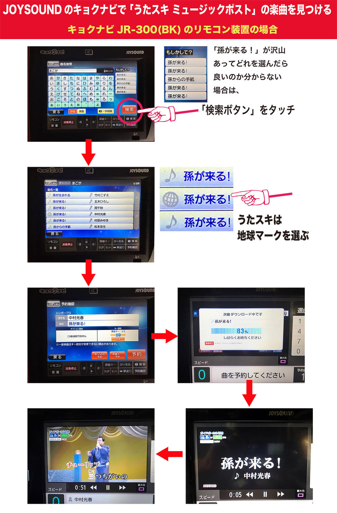うたスキ ミュージックポストは、「地球マーク」のついている楽曲を選んでタッチして下さい。