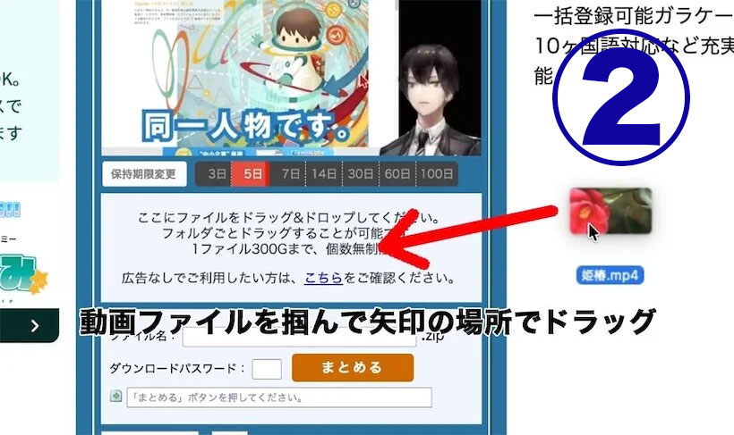 ① 上記サイトを開き、制作した動画ファイルを画面上にドラッグ&ドロップします。