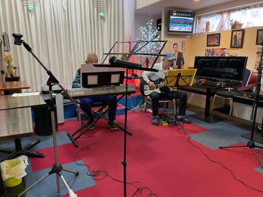 JOYSOUNDの通信機器にエレキギターなどの楽器を接続して楽器の練習もできます。